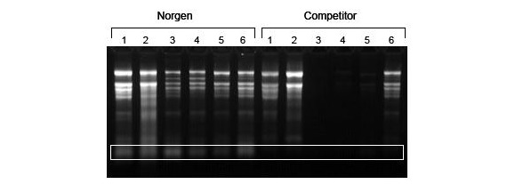 Figure 1: Isolation of High Quality RNA, even from Difficult Samples. Total RNA was isolated from 50 mg samples of apple (Lanes 1), peach (Lanes 2), grape (Lanes 3), pine needle (Lanes 4), strawberry (Lanes 5) and pear (Lanes 6) using Norgen’s kit and a competitors kit. Five µL of total RNA from the 50 µL of elution was loaded on 1X MOPS 1.0 % Formaldehyde-Agarose RNA gel for analysis. Norgen’s kit allowed for the isolation of high quality RNA from all the samples, including the difficult samples, while the competitor failed to isolate RNA from grape, pine needles and strawberry. Furthermore, only Norgen’s kit was able to isolate the small RNA species (white box).