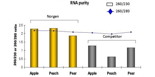 Figure 4: High Purity of RNA Samples Isolated from Apple, Peach and Pear. RNA was isolated from 50 mg samples of apple, peach and pear using Norgen's Plant/Fungi RNA Purification Kit and a competitor's kit. RNA purity was determined spectrophotometrically for the RNA isolated using Norgen's kit (260/230 = gold bars) and the competitor's kit (260/230 = grey bars). Also shown is the 260/280 ratio for the samples. Norgen's kit consistently isolated pure samples of Plant RNA with 260/230 ratios above 2.0, whereas the competitor's kit had 260/230 ratios below 1.2 for the same samples.